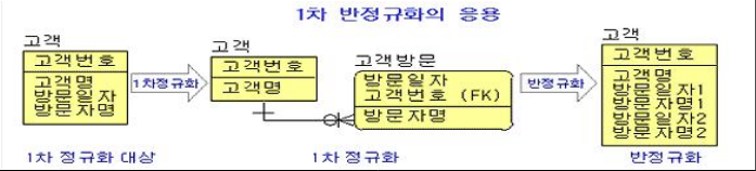 - 고객에 대한 엔티티 타입에 방문을 두 번까지 가능하다고 할 때 고객번호, 고객명이 중복 속성 값을 갖기 때문에 1차 정규화의 대상이 되어 중간에 있는 고객방문 엔티티 타입으로 1차 정규화가 되었다. 그러나 최대 2회까지 방문이 가능하다는 업무 규칙을 이용하여 성능과 단순성을 고려하여 오른쪽에 있는 1차 정규화에 대한 비정규화 엔티티 타입으로 설계된 예이다.